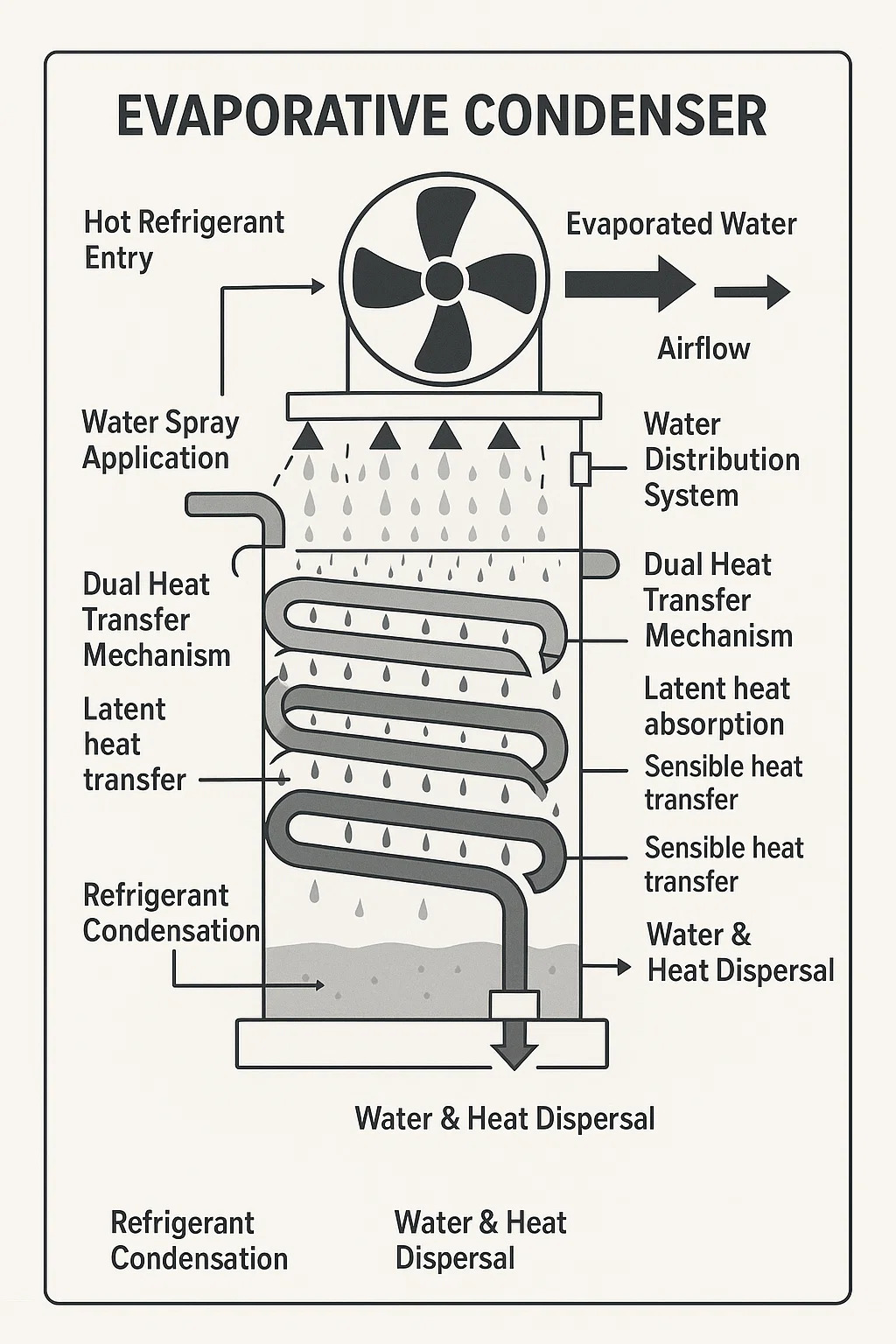 Condensatoarele evaporative resping căldura combinând răcirea cu aer cu evaporarea apei. Spre deosebire de condensatoarele standard care se bazează exclusiv pe transferul sensibil de căldură, aceștia beneficiază de absorbția de căldură latentă în timpul evaporării apei.